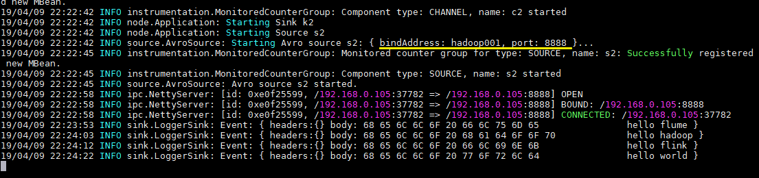 这里建议按以上顺序启动,原因是avro.source会先与端口进行绑定,这样avro sink连接时才不会报无法连接的异常。但是即使不按顺序启动也是没关系的,sink会一直重试,直至建立好连接。