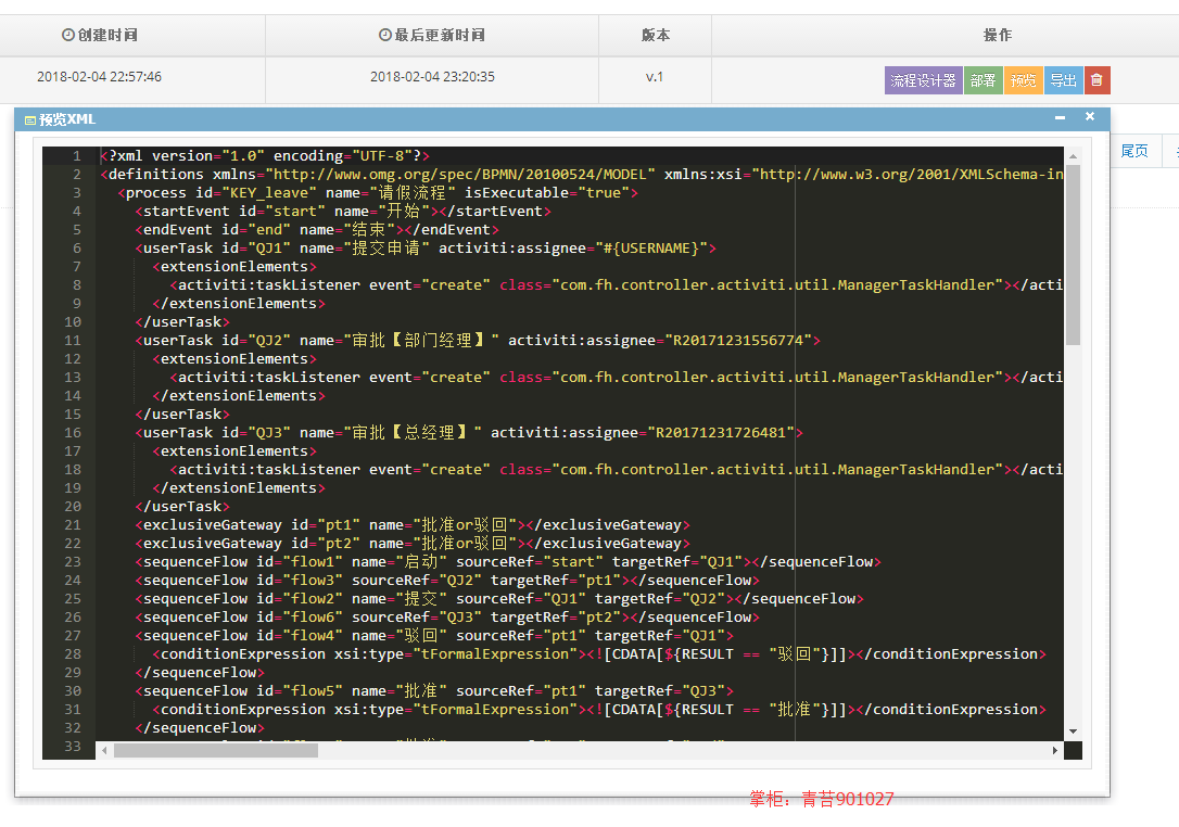 1.模型管理 :web在线流程设计器、预览流程xml、导出xml、部署流程