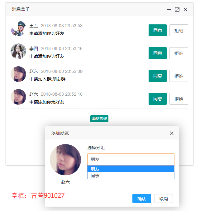 时通讯:支持好友,群组,发图片、文件,消息声音提醒,离线消息,保留聊天记录
