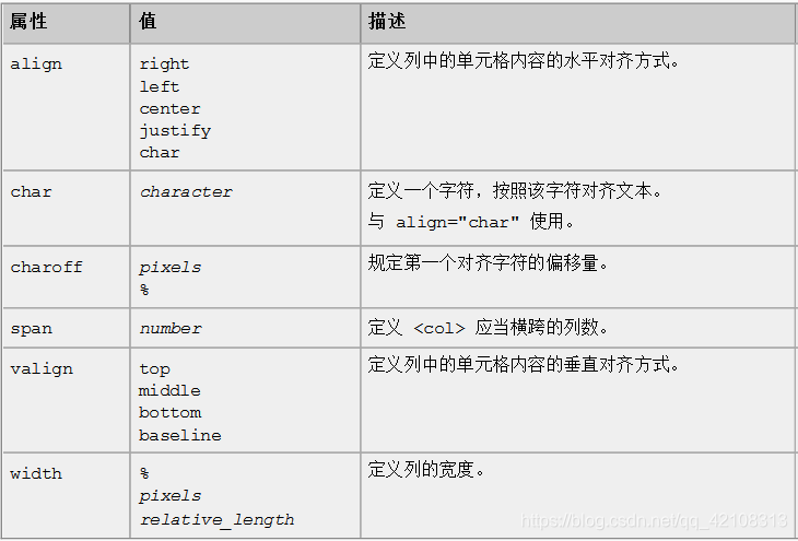 < col > 标签为表格中的一个或多个列定义属性值。只能在表格或列组中使用该元素。