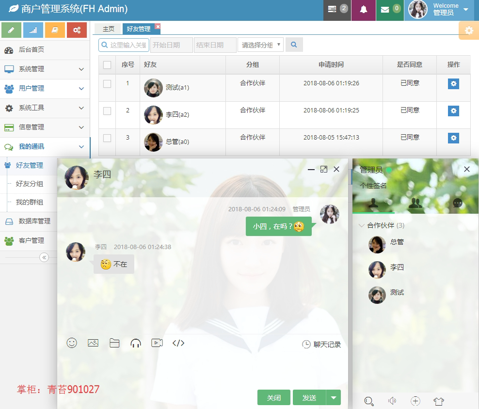 7. 系统用户:对各个基本的用户增删改查,单发、群发站内信邮件短信,导入导出excel表格,查看商户经营状况