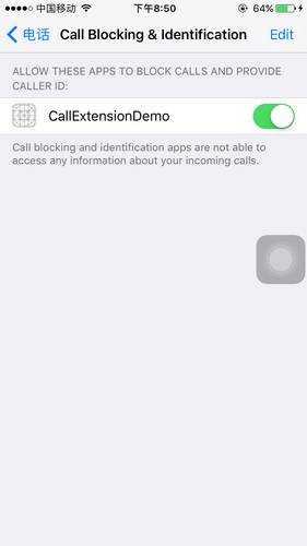 之后我们运行该 App 到设备中,然后进入设备的设置 —> 电话 —> Call Blocking & Identification,开启我们的 App 即可。如下图所示: