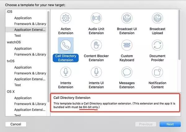 Xcode —> File —> New —> Target。创建一个 Call Directory Extension,如下图所示: