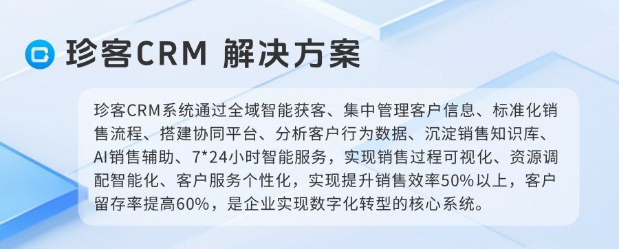珍客CRM功能有:通过全渠道智能获客、集中管理客户信息、标准化销售流程、搭建协同平台、分析客户行为数据、沉淀销售知识库、全场景AI辅助;具备系统集成、低代码PaaS平台、AI SaaS能力,灵活适配企业个性化需求,多种部署方式,实现客户资源数据化、销售管理流程化、销售过程可视化、市场营销自动化、业务决策智能化、资源调配智能化、客户服务个性化;全面助力企业高效管理客户关系与业务流程,实现提升销售效率80%以上,客户留存率提高60%,是企业实现数字化转型的关键系统。