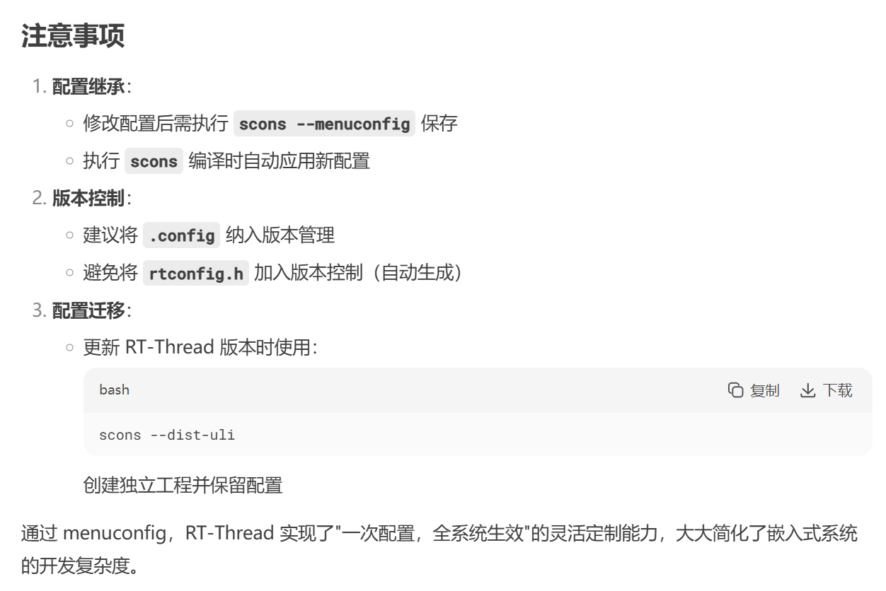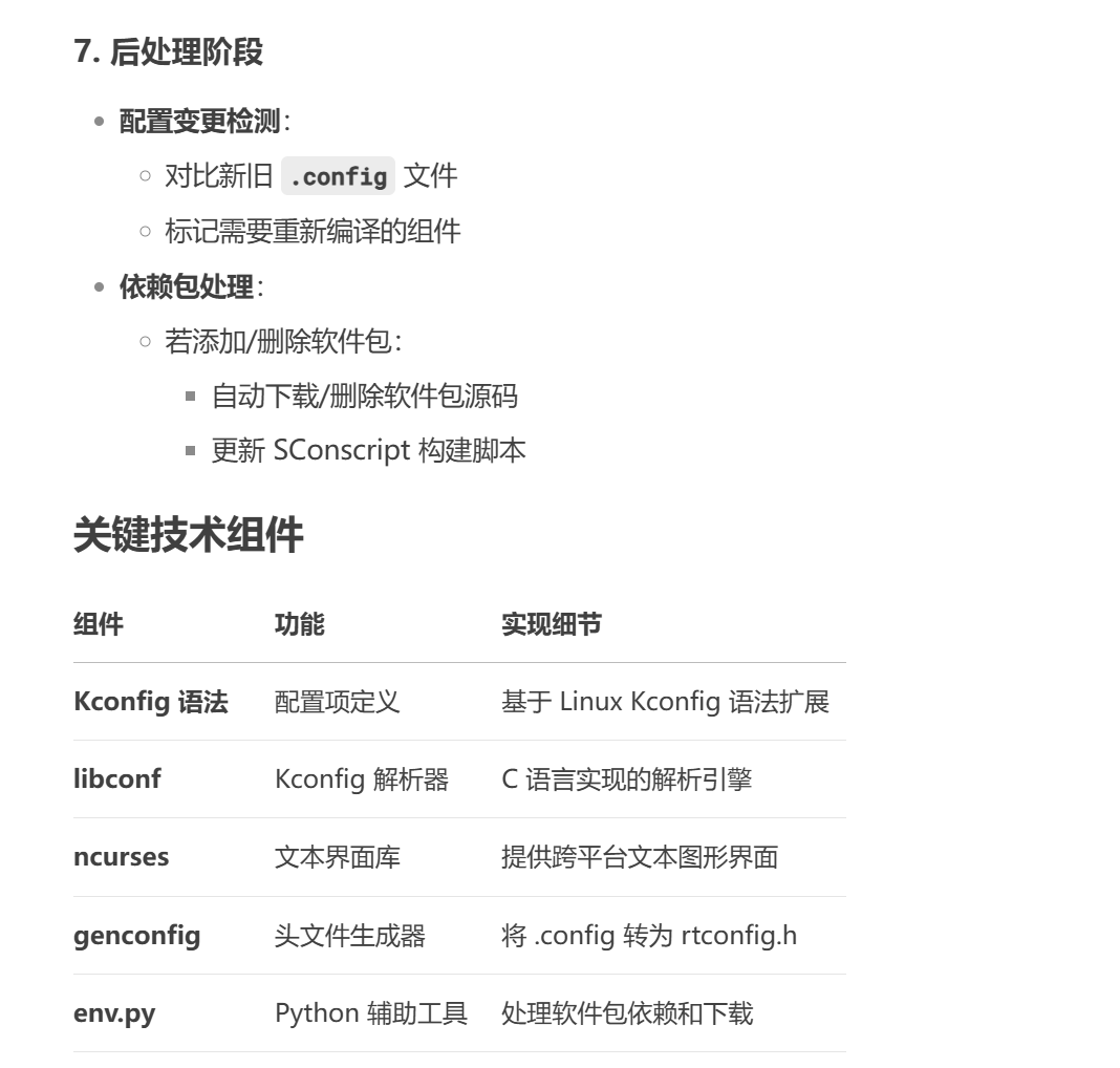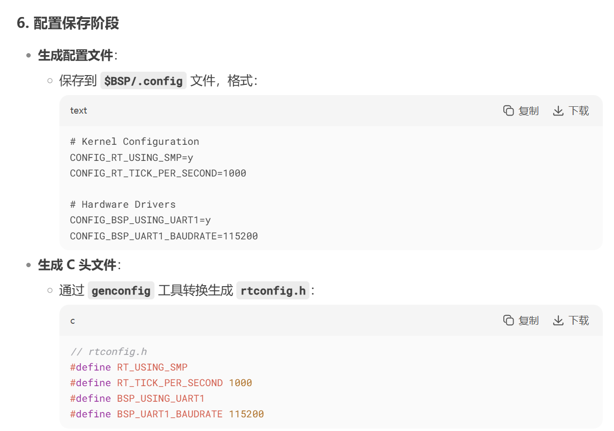 - 配置系统(通过`genconfig`工具)解析`.config`文件,生成`rtconfig.h`。该头文件中包含类似如下的宏定义:
