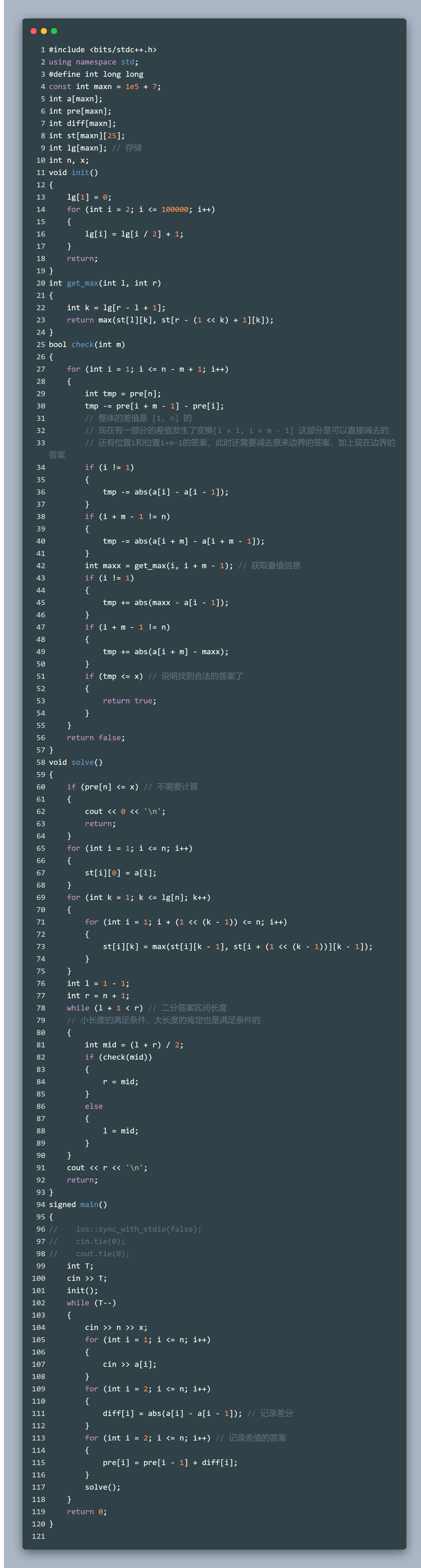 另外可以观察得到,长度越长,此时的数组权值越小,越容易满足题目要求。