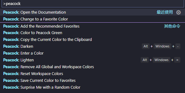 使用快捷键 Ctrl+Shift+P 可以快速调出 Command Palette,输入 "Peacock:"