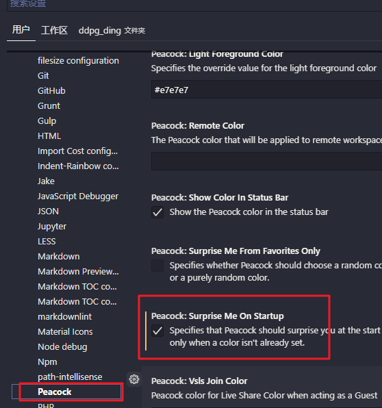 设置----插件扩展--peacock----"peacock.surpriseMeOnStartup" 设置为 true