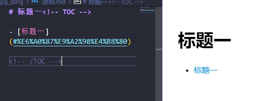在命令面板中,搜索并选择:Markdown TOC: Insert/Update ,将会在光标位置插入目录,并在每个标题下面增加锚点,便于目录链接到每个标题的行内跳转。
