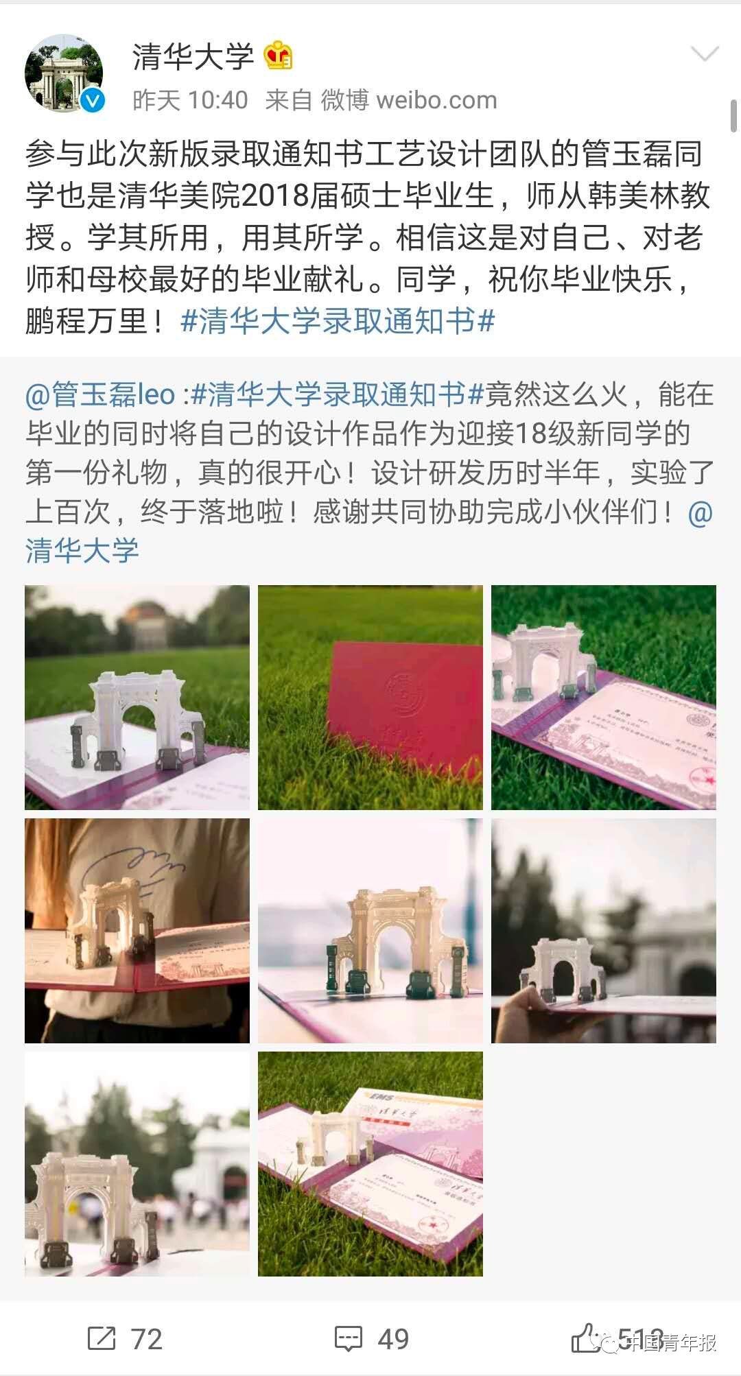 据清华大学官微介绍,参与此次新版录取通知书工艺设计团队的管玉磊同学也是清华美院2018届硕士毕业生。
