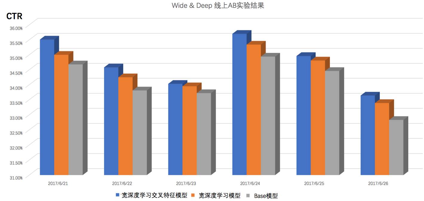 下图是包含了组合特征的宽深度模型与Base模型的线上实验效果对比图: