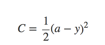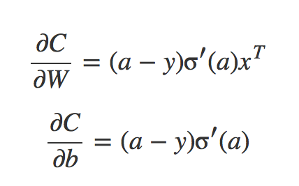 其中y是我们期望的输出,a为神经元的实际输出a=σ(Wx+b)。由于深度学习反向传递的机制,权值W与偏移量b的修正公式被定义为:
