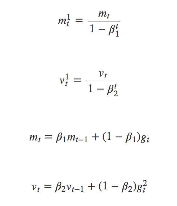 Adam是一个结合了Momentum与Adagrad的产物,它既考虑到了利用动量项来加速训练过程,又考虑到对于学习率的约束。利用梯度的一阶矩估计和二阶矩估计动态调整每个参数的学习率。Adam的优点主要在于经过偏置校正后,每一次迭代学习率都有个确定范围,使得参数比较平稳。其公式为: