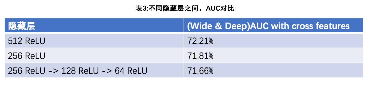 随着隐藏层宽度的增加,线下训练的效果也会随着逐步的提升。但考虑到线上实时预测的性能问题,我们目前采用256->128->64的框架结构。