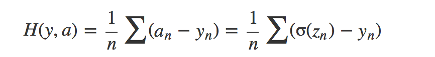 深度学习同样有许多损失函数可供选择,如平方差函数(Mean Squared Error),绝对平方差函数(Mean Absolute Error),交叉熵函数(Cross Entropy)等。而在理论与实践中,我们发现Cross Entropy相比于在线性模型中表现比较好的平方差函数有着比较明显的优势。其主要原因是在深度学习通过反向传递更新W和b的同时,激活函数Sigmoid的导数在取大部分值时会落入左、右两个饱和区间,造成参数的更新非常缓慢。具体的推导公式如下: