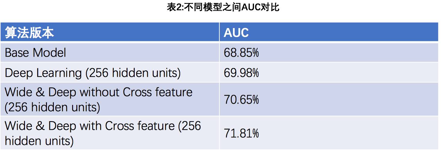 在实验阶段,分别将深度学习、宽深度学习以及逻辑回归做了一系列的对比,将表现比较好的宽深度模型放在线上与原本的Base模型进行AB实验。从结果上来看,宽深度学习模型在线下/线上都有比较好的效果。具体结论如下: