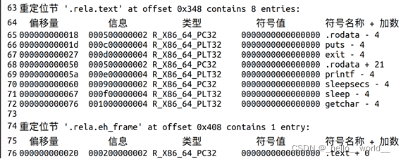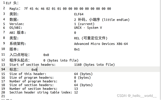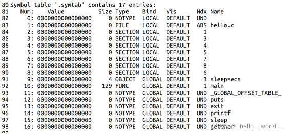 - 汇编,在汇编器as的处理下,hello.s生成了可重定位文件hello.o