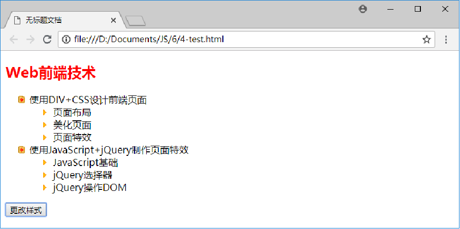 - 点击页面的“更改样式”按钮后,使用 jQuery 设置标题“Web 前端技术”的字体颜色为红色