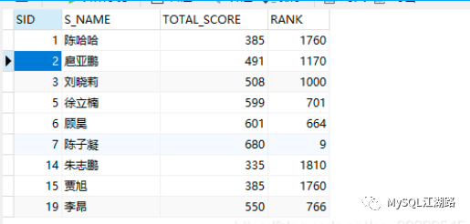 SELECT * FROM statistics;+----+----------+--------------+| id | class_id | average |+----+----------+--------------+| 1 | 1 | 475.5 || 2 | 2 | 473.33333333 || 3 | 3 | 488.66666666 |+----+----------+--------------+3 rows in set (0.00 sec)