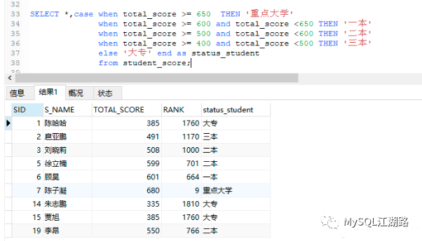 SELECT *,case when total_score >= 650 THEN '重点大学'when total_score >= 600 and total_score <650 THEN '一本'when total_score >= 500 and total_score <600 THEN '二本'when total_score >= 400 and total_score <500 THEN '三本'else '大专' end as status_studentfrom student_score;