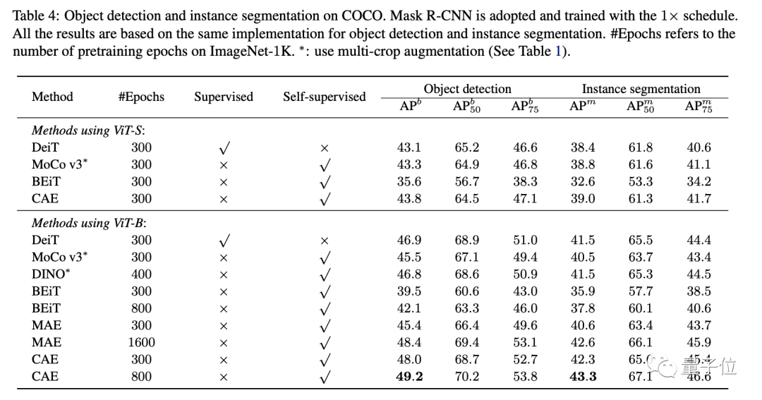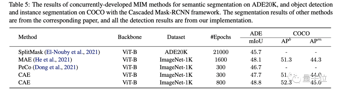 除此之外,也进一步验证了以CAE为代表的MIM方法,要比Moco v3、DINO为代表的对比学习方法更适合下游任务。