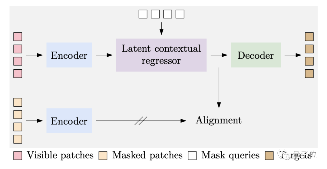 4、Latent representation alignment对 Zm添加约束,希望 latent contextual regressor 的输出和编码器的输出在同一空间。具体来说,图像的掩蔽patch也将输入到编码器中(此过程不参与梯度反传),获得的这部分表征,作为Zm的学习目标。