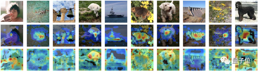 论文对CAE和MoCo v3的注意力图做了可视化。红色表示注意力值更高,蓝色表示注意力值更低。第一行是原图,第二行是 MoCo v3,第三行是 CAE。可以看到,MoCo v3 的注意力图主要在图像的主体区域有高响应,而 CAE 能考虑到几乎所有patch。