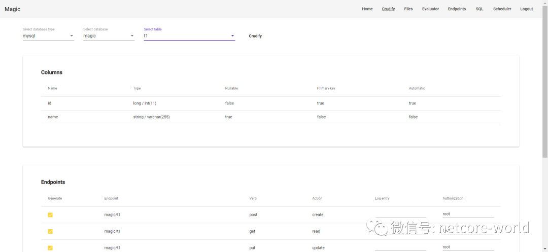 Magic是一个CRUD后端生成器,内置于ASP.NET内核中。它的目的是让你“神奇地”做一些无聊的事情,通过使用自动化技术,创建80%的CRUD端点,自动包装MySQL或MS SQL Server数据库,同时你可以专注于有趣的事情。