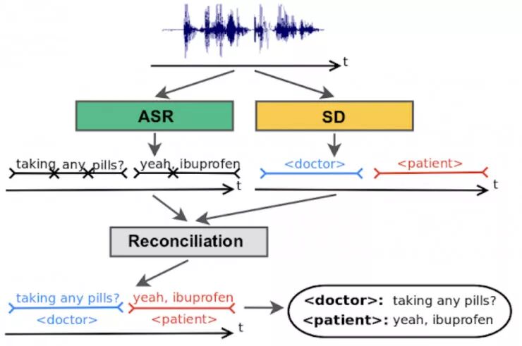 在真实场景下,说话人分类系统与声学语音识别(ASR)系统会并行化运行,这两个系统的输出将会被结合,从而为识别出的单词分配标签。