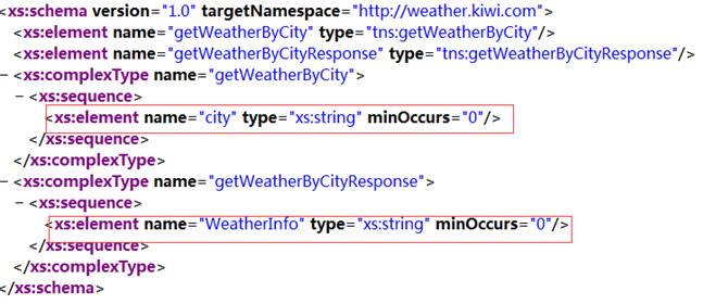 7、Message对应element节点。Element节点对应complexType节点描述了参数及返回值的数据类型。