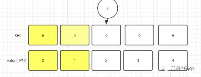当j = 3是,此时出现重复的字符(黄色的表示已经被代替的字符)。