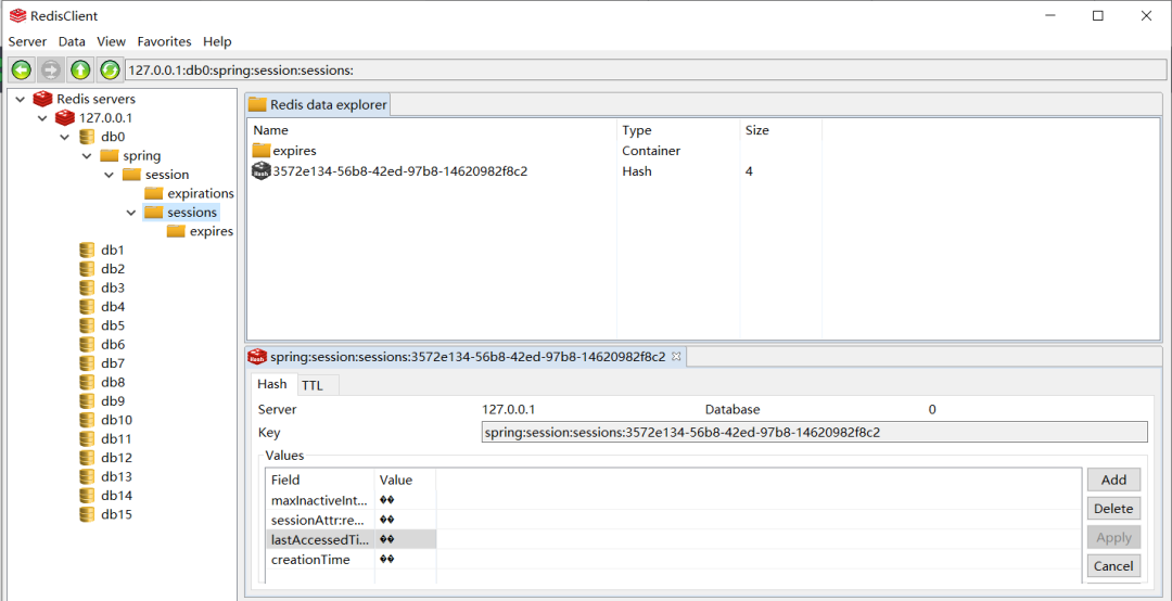 通过redis客户端工具连接redis服务,可以看到redis中已经存在springsession相关数据,此时也可以看到设置的sessions值。