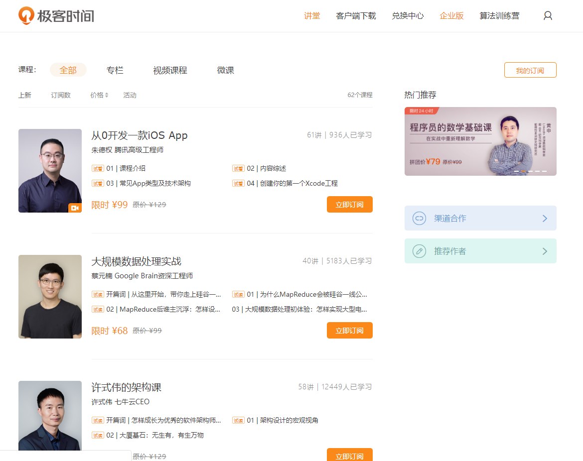 极客时间(https://time.geekbang.org/),想必大家都知道的,上面有很多值得大家学习的课程,如下图: