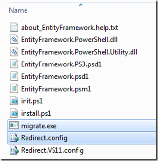如果忽略-SourceMigration开关,则使用最后一次应用的迁移作为起点,忽略-TargetMigration,则使用最新迁移作为终点。 4. 应用程序启动时自动升级通过注册 MigrateDatabaseToLatestVersion 数据库初始值设定项来实现该功能。数据库初始值设定项只是包含用于确保数据库安装正确的某种逻辑。首次在应用程序进程 (AppDomain) 中使用上下文时,将运行此逻辑。 Demo中执行 Database.SetInitializer(new MigrateDatabaseToLatestVersion<OrderContext, Configuration>()); 其中Configuration生成的是internal sealed class,不在一个程序集中需要修改成public 三、使用Migrate.exe迁移将命令行工具migrate.exe复制到包含迁移配置的程序集位置,可以在VS外部进行迁移操作。 在使用 NuGet 安装实体框架时,migrate.exe 位于下载包的 tools 文件夹中。在 <项目文件夹>\packages\EntityFramework.<版本>\tools 中 有了 migrate.exe 之后,需要将其复制到包含迁移的程序集位置。 如果应用程序面向 .NET 4 而不是 4.5,则还需要将 Redirect.config 复制到这个位置,并将其重命名为 migrate.exe.config。这样,migrate.exe 会让正确的绑定重定向能够找到实体框架程序集。 注意:migrate.exe 目前不支持 x64 程序集。 Migrate.exe的使用migrate.exe /? 显示帮助信息 migrate assembly [configurationType] [/targetMigration] [/startUpDirectory] [/startUpConfigurationFile] [/startUpDataDirectory] [/connectionStringName] [/connectionString] [/connectionProviderName] [/force] [/verbose] [/?] Assembly 指定包含迁移配置类型的程序集 [configurationType] 指定迁移配置类型的名称 [connectionProviderName] 指定连接字符的provider [connectionString] 指定使用的连接字符串 [connectionStringName] 指定配置文件中使用的连接字符串名称 [force] 表示允许自动迁移引起数据丢失 [startUpConfigurationFile] 指定程序的Web.config或App.config [startUpDataDirectory] 指定当解析包含|DataDirectory|的连接字符串时使用的目录 [targetMigration] 指定迁移到的版本 [verbose] 指定输出执行的SQL和其他信息到控制台 本Demo中执行 migrate Demo.Domain.dll /startUpConfigurationFile="MigrationsDemo.exe.config" /targetMigration=” Add_Product_CreateDateAndUnit” /verbose |