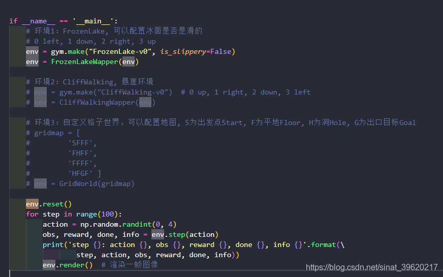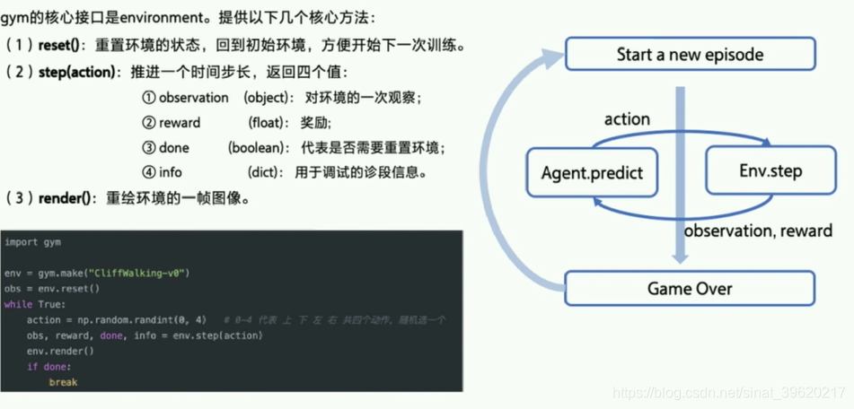 注意:从环境中获取的状态,有时候叫state,有时候叫observation,这两个其实一个代表全局状态,一个代表局部观测值,在多智能体环境里会有差别,但我们刚开始学习遇到的环境还没有那么复杂,可以先把这两个概念划上等号。