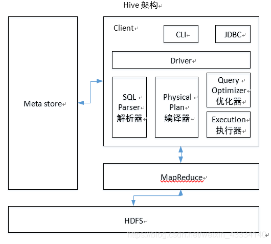 Hive 通过给用户提供的一系列交互接口,接收到用户的指令(SQL),使用自己的 Driver,结合元数据(MetaStore),将这些指令翻译成 MapReduce,提交到 Hadoop 中执行,最后,将执行返回的结果输出到用户交互接口。