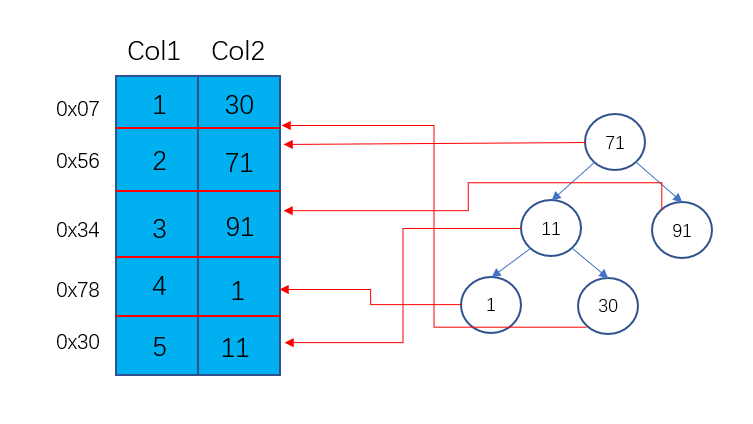 使用索引的如下图:(如果是使用二叉树结构)每一个节点都存放数据行的磁盘地址【快速定位到数据】
