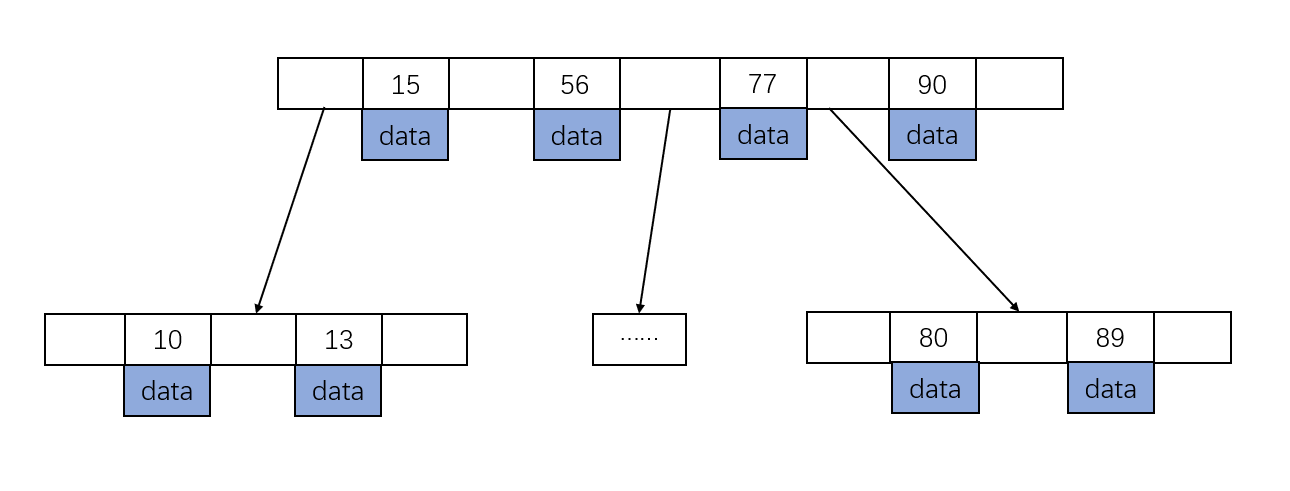 这样树的高度就解决了,横向存储更多,但是为什么不选择BTree呢,因为页节点有默认大小的,如果每个节点都存储数据data,这时页节点就存储的个数不多,这样会增加树的高度.
