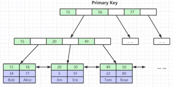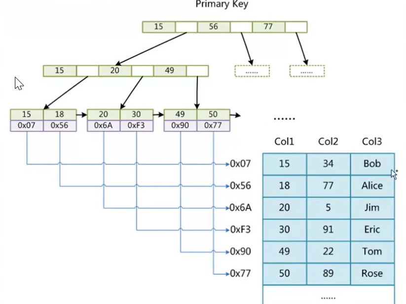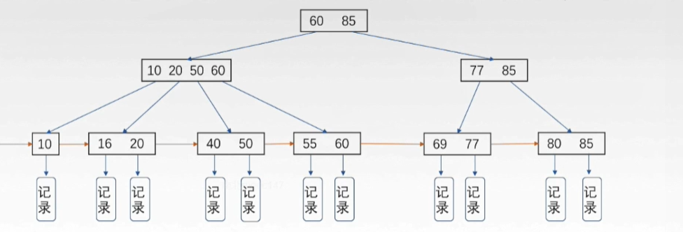 比如查找 范围在20-50的数据,首先查找20,之后通过20后面的指针指向后面的往后查找,直到查找到大于50的为止(通过这个叶子节点的指针可以看出,连续且自增的主键好处),使用主键自增的可以避免页节点的元素分裂导致范围查询效率低。