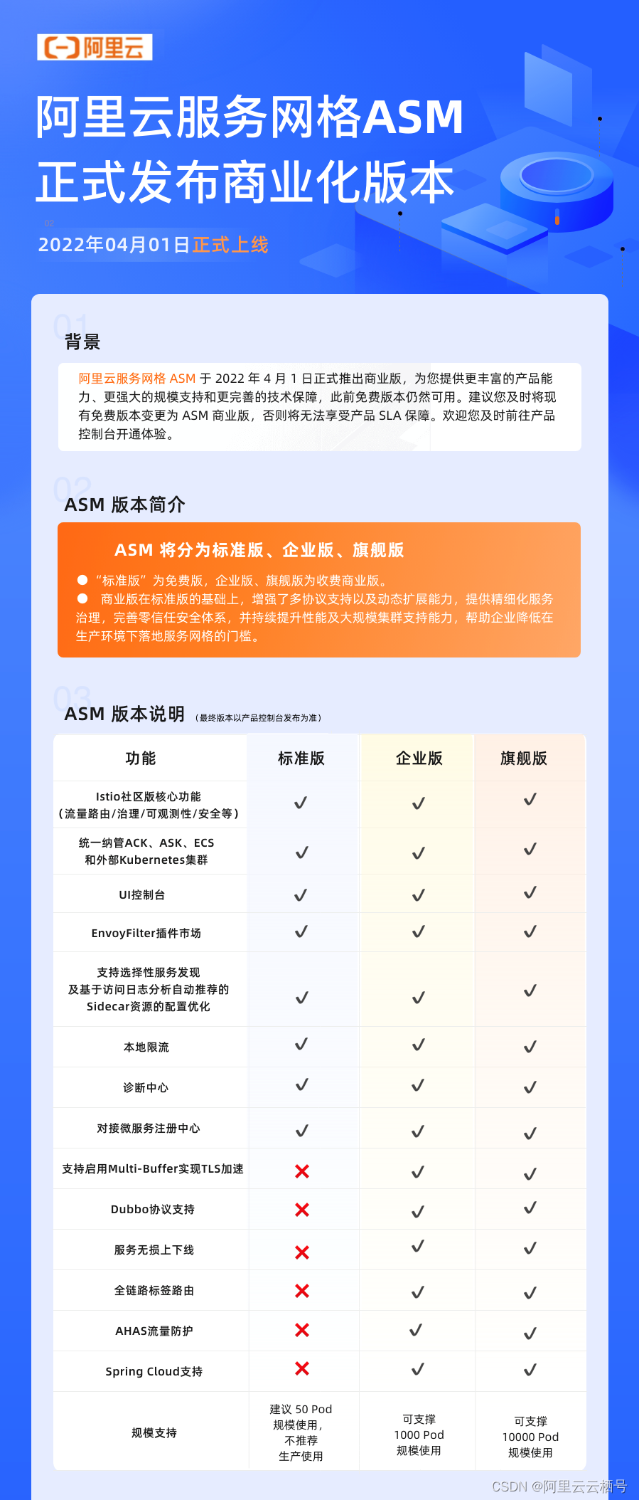 自 2022 年 4 月 1 日起,阿里云服务网格 ASM 将分为标准版、企业版、旗舰版,其中“标准版”为免费版,企业版、旗舰版为收费商业版。商业版在标准版的基础上,增强了多协议支持以及动态扩展能力,提供精细化服务治理,完善零信任安全体系,并持续提升性能及大规模集群支持能力,降低在生产环境落地服务网格的门槛。