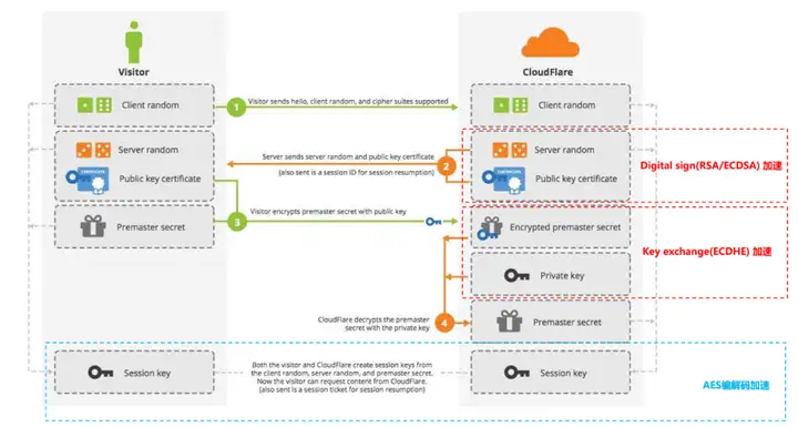硬件加速核心是将TLS中的非对称加解密操作剥离出来,放到硬件加速卡里计算,即解放了CPU,同时专用的硬件加速卡也提供了更高的加解密性能,这是典型的硬件OffLoad技术方案。