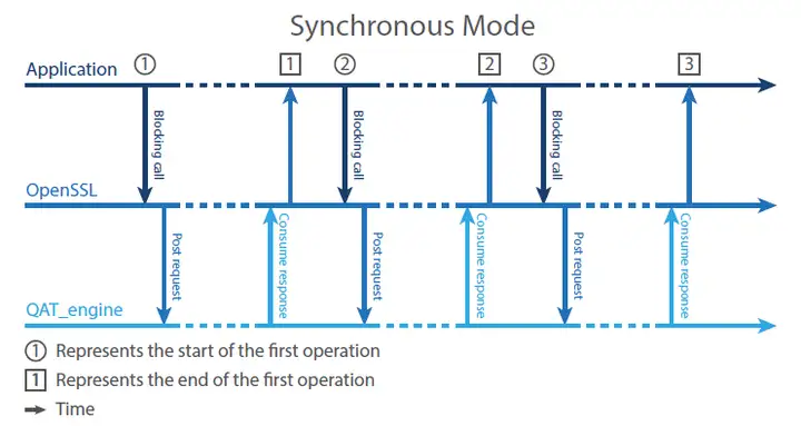 OpenSSL 未启用异步ASYNC模式时,OpenSSL 调用是同步阻塞的,直到QAT_Engine返回结果。如下图的同步模式,在并发处理执行流的场景,大量CPU处于空闲等待的状态(图中虚线表示CPU处于空闲状态),无法有效地利用CPU。