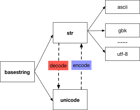 Python2 中有两种和字符串相关的类型:str 和 unicode,它们的父类是 basestring。其中,str 类型的字符串有多种编码方式,默认是 ascii,还有 gbk,utf-8 等,unicode 类型的字符串使用 u'...' 的形式来表示,下面的图展示了 str 和 unicode 之间的关系: