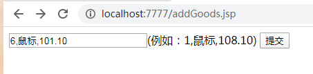 <input type="text" name="goods" id="goods" placeholder="请输入商品:编号, 名称, 价格">(例如:1,鼠标,108.10)