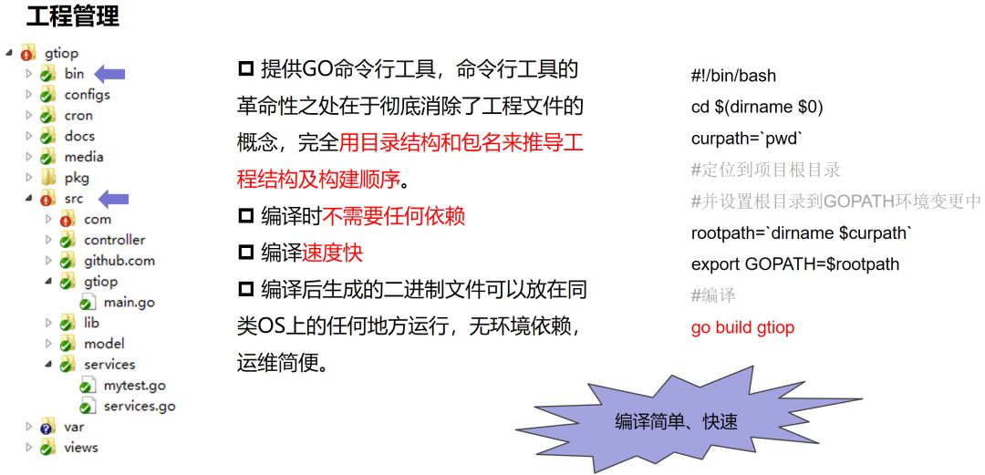 在GO项目下,存在两个关键目录,一个是src目录,用于存放所有的.go源码文件;一个是bin目录,用于存在编译后的二进制文件。在src目录下,除了main主包所在的目录外,其它所有的目录名称与直接目录下所对应的包名保持对应,否则编译无法通过。这样,GO编译器就可以从main包所在的目录开始,完全使用目录结构和包名来推导工程结构以及构建顺序,避免像C++一样,引入一个额外的Makefile文件。