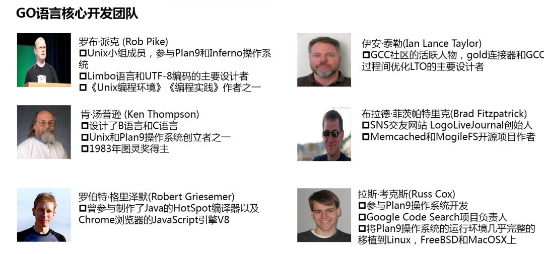 GO语言的开发阵营可以说是空前强大,主要成员中不乏计算机软件界的历史性人物,对计算机软件的发展影响深远。Ken Thompson,来自贝尔实验室,设计了B语言,创立了Unix操作系统(最初使用B语言实现),随后在Unix开发过程中,又和Dennis Ritchie一同设计了C语言,继而使用C语言重构了Unix操作系统。Dennis Ritchie和Ken Thompson被称为Unix和C语言之父,并在1983年共同被授以图灵奖,以表彰他们对计算机软件发展所作的杰出贡献。Rob Pike,同样来自贝尔实验室,Unix小组重要成员,发明了Limbo语言,并且和Ken Thompson共同设计了UTF-8编码,《Unix编程环境》、《编程实践》作者之一。