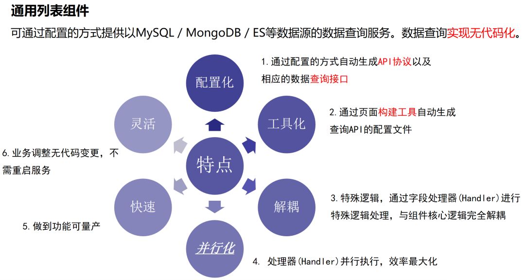通用列表组件用于所有可能的二维数据源(如MySQL/MongoDB/ES等等)的数据查询场景,从一个面上解决了数据查询问题。在Uwork项目开发中,被大量使用,实现数据查询接口和页面查询列表的量产开发。它以一个JSON配置文件为中心,来实现对通用数据源的查询,并将查询结果以API或页面的形式自动返回给用户。整个过程中几乎没有代码开发,而唯一要做的只是以一种统一的规范编写配置文件(而不是代码),真正实现了对数据查询需求的功能量产。
