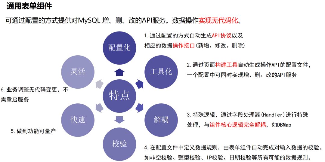通用表单组件主要用于对数据库的增、删、改场景。该组件在Uwork的项目开发中,也有广泛的应用,与通用列表类似,以一个JSON配置文件为中心,来完成对数据表数据的增、删、改操作。特别是近期完成的部件级SDB管理平台,通过通用表单实现了对整个系统的数据维护,通过高度抽象化,做到了业务的无代码化生产。
