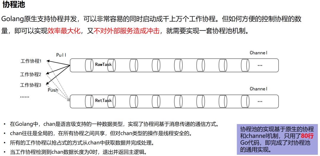 GO语言本身支持协程并发,协程非常轻量,可以快速启动成千上万个协程工作单元。如果对协程任务的数量控制不当,最后的结果很可能适得其反,从而对外部或本身的服务造成不必要的压力。协程池可以在一定程度上控制执行单元的数量,保证执行的安全性。而在Golang中要实现这样一个协程池,是非常简单的,只需要对channel和goroutine稍加封装,就可以完成,整个构建过程不到80行代码。
