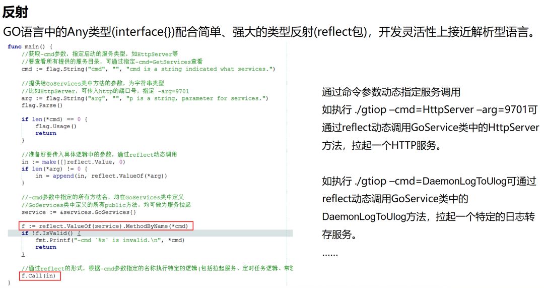 Golang作为强类型的编译型语言,灵活性上自然不如解析型语言。比如像PHP,弱类型,并且可以直接对一个字符串变量的内容进行new操作,而在编译型语言中,这显然不太可能。但是,Golang提供了Any类型(interface{})和强大的类型反射(reflect)能力,二者相结合,开发的灵活性上已经很接近解析型语言。在逻辑的动态调用方面,实现起来仍然非常简单。既然如此,那么像PHP这种解析型语言相比于GO,优势在那里呢?就我个人而言,写了近10年的PHP,实现过开发框架、基础类库以及各种公共组件,虽然执行性能不足,但是开发效率有余;而当遇上Golang,这些优势似乎不那么明显了。